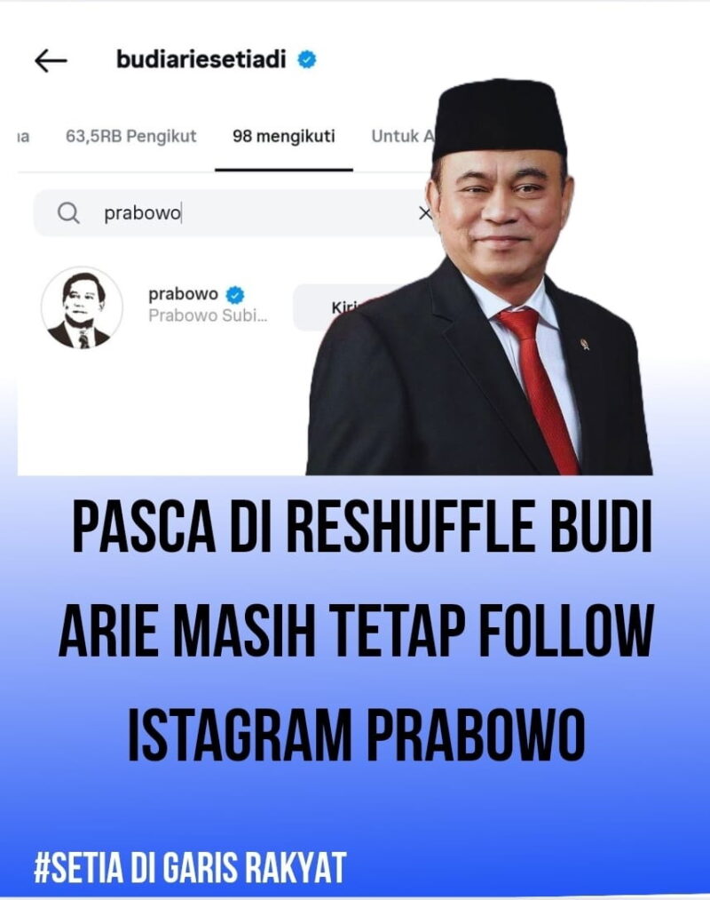 Menanggapi beragam komentar dan spekulasi yang muncul di media sosial terkait akun Instagram pribadi Budi Arie Setiadi yang sengaja di Framing dengan narasi Budi Arie Anfollow akun Presiden Republik Indonesia, Prabowo Subianto, padahal faktanya Budi Arie masih tetap teelihat dan setia vollow istagram Prabowo